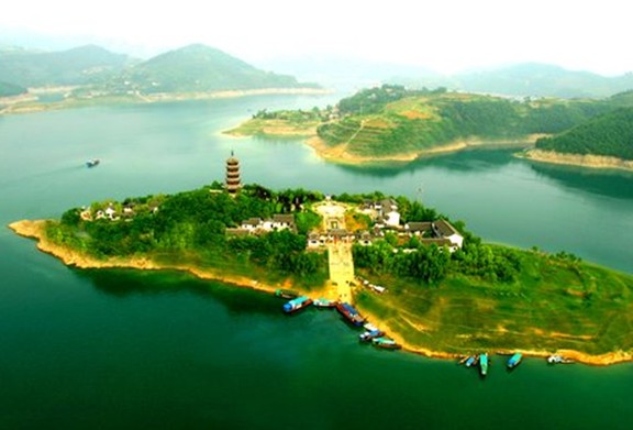 從空中俯看象一只美麗的孔雀開(kāi)屏,四周又在青山綠水碧波之間,因此取名翠屏島。從安康乘車經(jīng)瀛湖鎮(zhèn)入進(jìn)島路全長(zhǎng)30公里,距金螺島僅一公里。