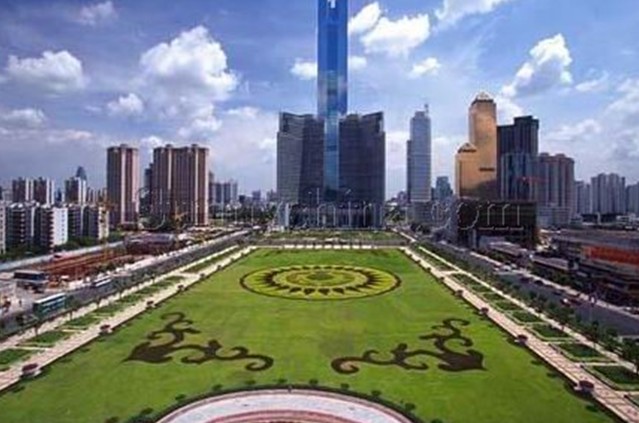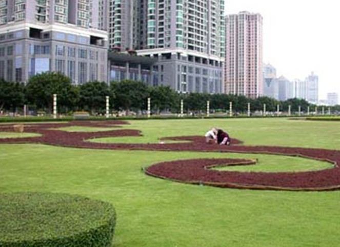 天河?xùn)|站綠化廣場(chǎng)位于廣州市新城市軸線上,占地面積4.7萬平方米,于1998年9月中旬動(dòng)工,1999年7月1日正式完成并交付使用。廣場(chǎng)中央綠地2.6萬平方米,鋪種馬尼拉草18315平方米,其中有6000平方米種植標(biāo)志性的紋樣,分圍種植1300平方米的福建茶綠籬。