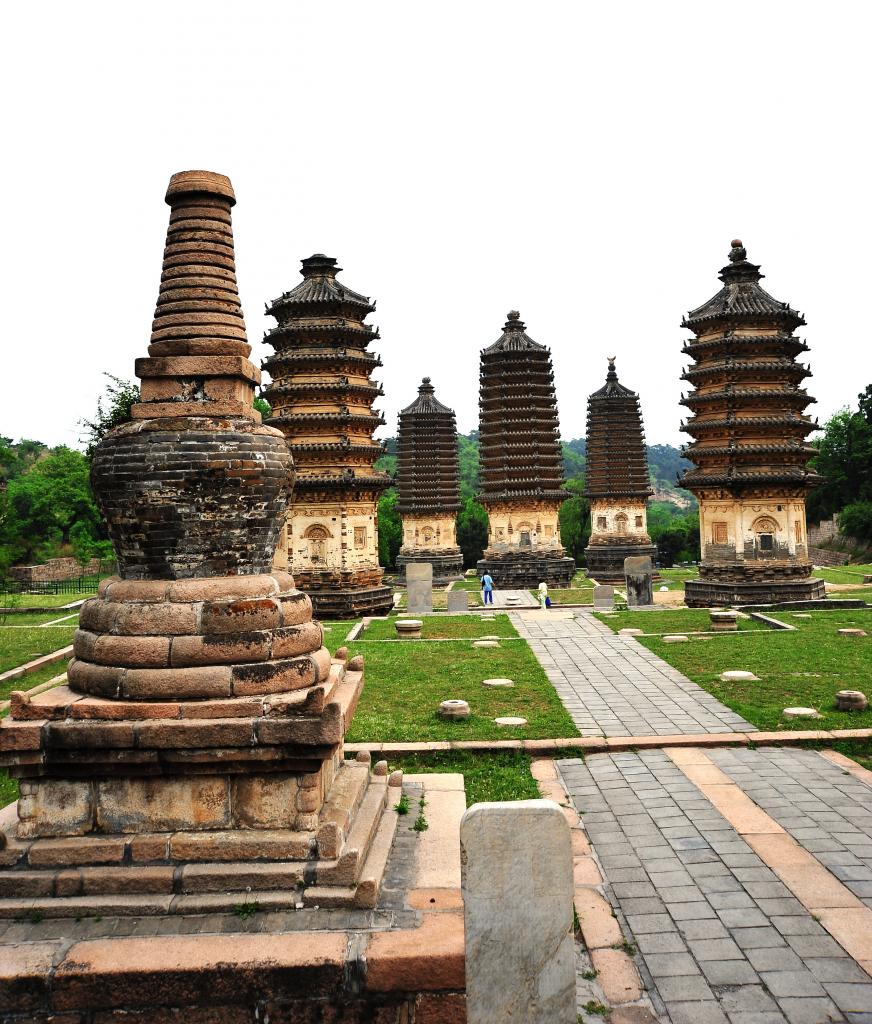 經(jīng)修繕,現(xiàn)景區(qū)內(nèi)可供參觀的古塔有18座。塔的形制、風(fēng)格各異。其中,密檐式磚塔共計有7座。其整體形象分別由“須彌座”式的塔基,雕刻有門窗、佛像的塔身,層層密檐和塔剎等部分組成。外輪廓線條挺拔秀麗,磚雕精美細膩,是研究古代建筑美學(xué)及佛教文化的絕好資料。