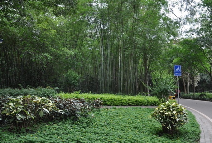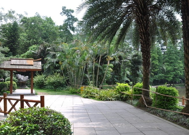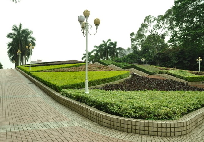 公園環(huán)境舒適,草坪舒展,山丘起伏,林木蒼翠,湖波粼粼,好一派自然清新的郊野風情。氣勢宏偉的南北大門景色,門前廣場橫跨寬度達 100 米,建筑風格獨特,植物色彩配置艷麗,布置緊湊,頗有現(xiàn)代公園氣派。最為壯觀的南門中軸廣場,兩側(cè)種植風景林,配置各類棕櫚植物,襯托著中央的立體八角花壇,更加洋溢著嶺南園林的氣息。