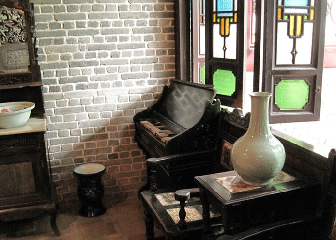 正廳東側(cè)是書廳,擺設(shè)仍然依照舊模樣,書桌、書柜、古董柜一應(yīng)俱全,書桌上擺放著毛筆、墨硯,墻上掛著古畫鏡框,透著濃濃的書卷味,一側(cè)桌上擺放著古老笨重的留聲機(jī),飄出的幽幽的音樂,應(yīng)該是周璇、白光她們的聲音了:紅著臉、跳著心,你的靈魂,早已經(jīng),在飄飄飄個(gè)不停!低婉沉醉,香甜軟糯。那是當(dāng)時(shí)的流行曲呢。