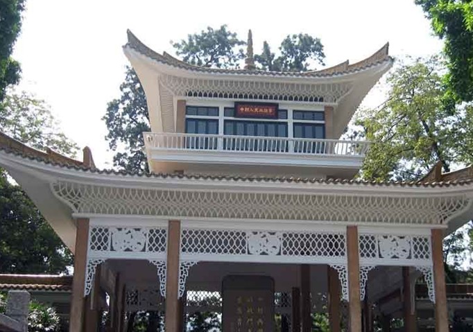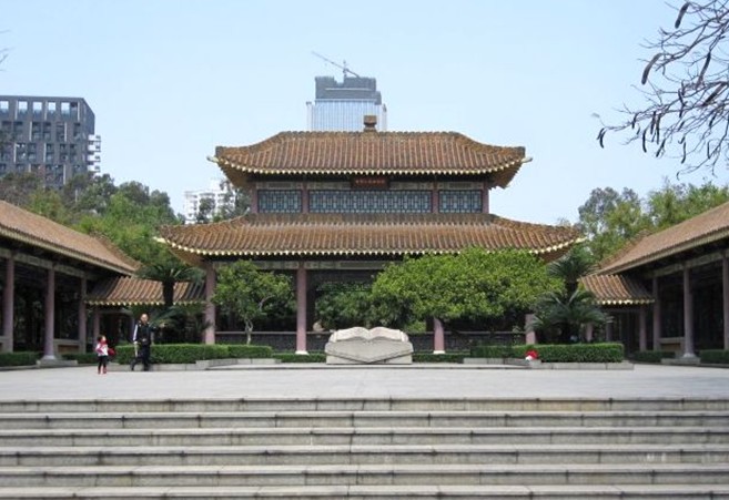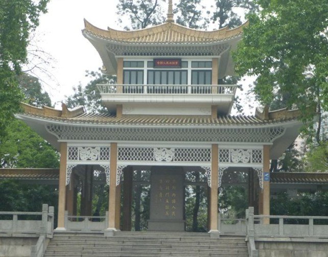 中朝人民血誼亭位于廣州起義烈士陵園內(nèi)東面,與中蘇人民血誼亭相對(duì)。建于1964年,坐南朝北。建筑平面呈“凹”字形,占地面積約3000平方米。黃色琉璃瓦,鋼筋混凝土結(jié)構(gòu)。主亭面闊三間12.85米,進(jìn)深三間13.06米,高二層,四角攢尖頂。上懸“中朝人民血誼亭”匾額。兩側(cè)各有總長(zhǎng)為33.7米的曲尺型長(zhǎng)廊,兩廊各連接面闊6米,進(jìn)深5.5米的卷棚歇山頂副亭,平面呈方形。中國(guó)傳統(tǒng)形式的建筑基座,帶有朝鮮民族風(fēng)格的屋脊和檐口裝飾為金達(dá)萊花和木棉花結(jié)合的圖案。亭前是水池,小橋橫跨其中。亭中心矗立著高大的花崗巖石紀(jì)念碑,碑座高0.96米、碑身高 4.3米、闊2.6米,上嵌紅棉圖案。紀(jì)念碑正面刻“中朝兩國(guó)人民的戰(zhàn)斗友誼萬(wàn)古長(zhǎng)青”, 版權(quán)所有山東聊城聊之旅國(guó)際旅行社有限公司,轉(zhuǎn)載必究!落款為“葉劍英”,題于“1964年十月一日”。背面鐫刻著著名書(shū)法家吳子復(fù)書(shū)寫(xiě)的碑文,對(duì)在廣州起義中犧牲的朝鮮青年的事跡作了簡(jiǎn)明的介紹。