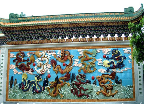 進入南粵苑大門,迎面是一幅大型的照壁——九龍壁,這是“龍翔鳳翥”美景。九龍壁下有雕花青石底座,上有“玉包金”琉璃瓦蓋頂,四周是白玉石欄河。九龍壁有著王者氣派,顯示中華民族龍的文化源遠流長。為了突出龍的形象,制作者采用浮雕技術(shù)塑造燒制,很有立體感。在海水、祥云的映襯下,九條分別為黃色、紅色、紫色、白色、藍色的巨龍,喜戲龍珠,形態(tài)生動,翻騰自如,有如遨游滄海,又似騰飛九霄。特別是在陽光照射下,熠熠生輝,色彩斑斕,華美亮麗。