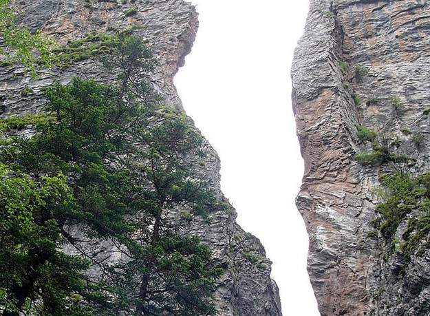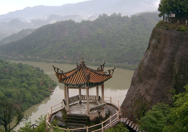 一線天又名靈巖,位于武夷群峰的西南端,是武夷的最奇的巖洞,素有“鬼斧神工之奇”的稱號。一線天,存在在九曲溪二曲南面的一個幽邃的峽谷中。里面一座巍然挺立的巨石,長數(shù)百丈,高千仞,名“靈巖”。巖端傾斜而出,覆蓋著三個毗鄰的巖洞:左為靈巖洞,中為風(fēng)洞,右為伏羲洞。從伏羲洞而入巖內(nèi),到了深處,抬頭仰望,但見巖頂裂開一罅,就像是利斧劈開一樣,相去不滿一尺,長約一百多米,從中漏進天光一線,宛如跨空碧虹,這就是令人嘆為觀止的一線天。