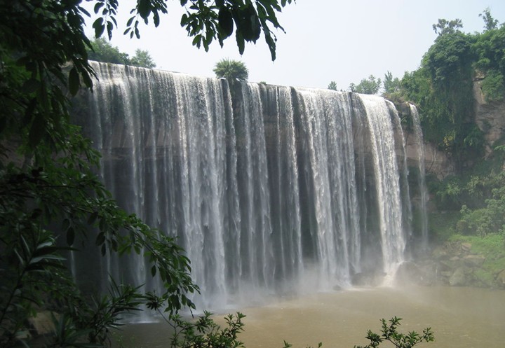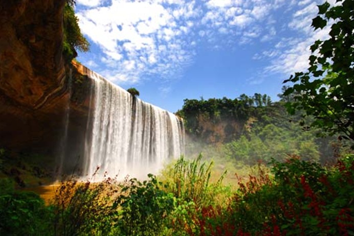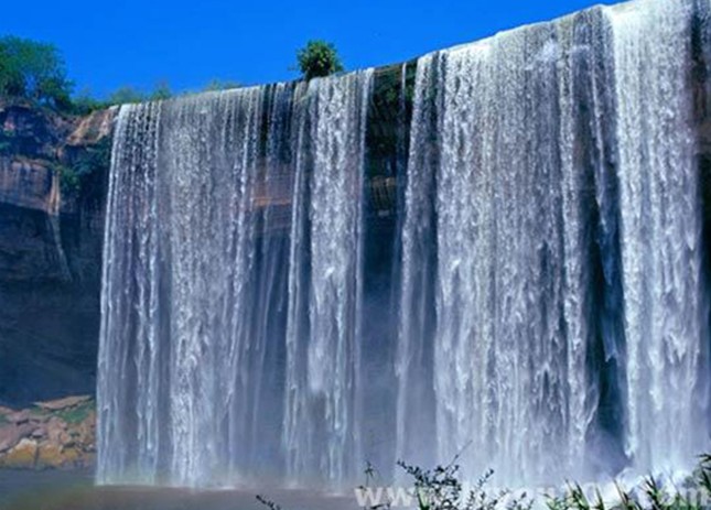 青龍大瀑布高120米,寬40米共有3級(jí)呈階梯狀,瀑布從崖頂騰空而起如同從天而降,讓人很容易記起李白“飛流直下三千尺,疑是銀河落九天”的詩(shī)句,瀑布?xì)鈩?shì)磅礴,猶如千軍萬(wàn)馬,直搗深谷,水流過(guò)處,飛珠濺玉,雷鳴轟動(dòng)。潭面瀑布撞擊的水花如同千簇綻開(kāi)的雪蓮,壯觀無(wú)比。
