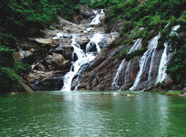 湯泉風景區(qū)最有名的當數(shù)九龍?zhí)镀俨?。溫泉西北的咫尺之遙,上蒼再顯神靈,又施仁愛,拋下一串“珍珠”———九龍?zhí)镀俨?,它在群山深處奔突而出,拾級而下,一步一潭,至山底第九潭,但見奔雷飛雪而落,蛟龍騰空而降,終聚九龍?zhí)镀俨?。溫泉和瀑布這一暖一涼,地下天上,遙相呼應,交相輝映,這在現(xiàn)代林林總總的人文景觀大家族中,可謂鳳毛麟角。