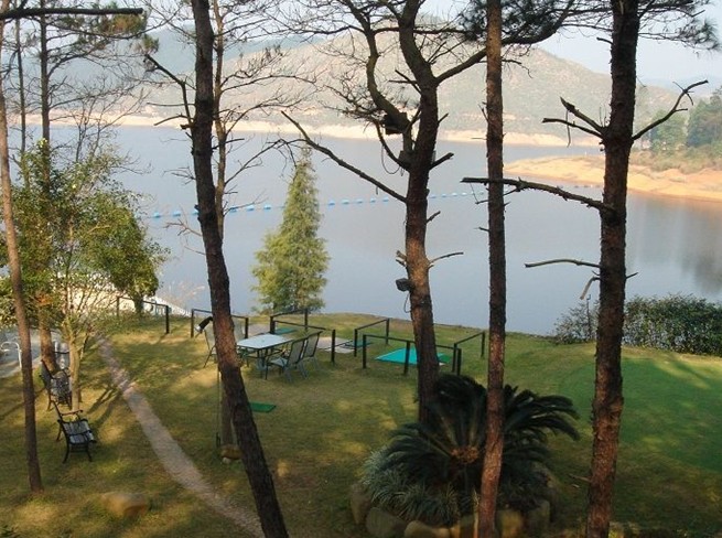 河?xùn)|名人山莊的高爾夫球練習(xí)場就建在湖邊的懸崖上,揮動球桿,小小的高爾夫球成拋物線狀優(yōu)雅地降落在碧綠的湖水里,這種妙不可言的感覺吸引了我們這幫從來沒有接觸過高爾夫球的門外漢。球場旁邊有一片松樹林,林中設(shè)有秋千和吊床,睡在吊床上,靜靜地透過高高的松樹看著潔凈如洗的藍(lán)天白云,只見遠(yuǎn)處山頂一堆蘑菇云慢慢地被風(fēng)吹著一路往山莊方向飄來,由厚變薄、由濃變淡,漸漸地變成羊毛般的云絮,隨著溫暖的春風(fēng)飄舞浮動,直至飄散、消融。在乒乓球臺前、網(wǎng)球場里,經(jīng)過一輪大汗淋漓的運動之后,再跳進(jìn)了碧綠的游泳池,一種清涼舒適的感覺必定涌上心頭。