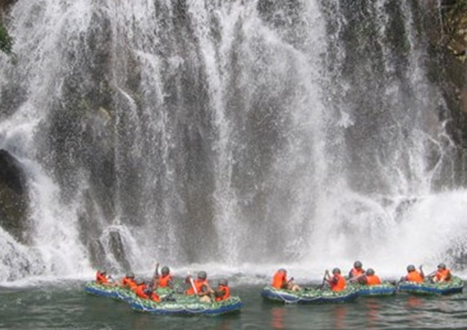 游客一進(jìn)入景區(qū),即置身于戰(zhàn)爭(zhēng)年代硝煙彌漫的烽火氛圍,游客換上專用的野戰(zhàn)軍服,組成一個(gè)個(gè)戰(zhàn)斗小分隊(duì),在戰(zhàn)斗分隊(duì)長(zhǎng)(導(dǎo)游)的帶領(lǐng)下,坐上披滿迷彩的運(yùn)兵車,沿著充滿革命根據(jù)地氣息的曲折而平坦的深山林道向戰(zhàn)地指揮部(起漂點(diǎn))行進(jìn)。車上,戰(zhàn)斗分隊(duì)長(zhǎng)向戰(zhàn)友們(游客)布置本次行動(dòng)的任務(wù),分析敵情,并作宣傳鼓動(dòng),領(lǐng)唱戰(zhàn)歌,高叫口號(hào),使士氣空前高漲。經(jīng)過十分鐘的行進(jìn),軍車到了目的地,在響聲震耳的瀑布聲中,更聽到了隆隆的炮聲,密集的槍聲,沿著峽谷峭巖古道而下,到了設(shè)在原始的飛天大瀑布旁邊的戰(zhàn)地指揮部,戰(zhàn)地參謀向戰(zhàn)友們訓(xùn)話并講述了戰(zhàn)斗要點(diǎn)和注意事項(xiàng)(漂流的有關(guān)常識(shí)),然后次序坐上戰(zhàn)船順流而下(開始漂流)。