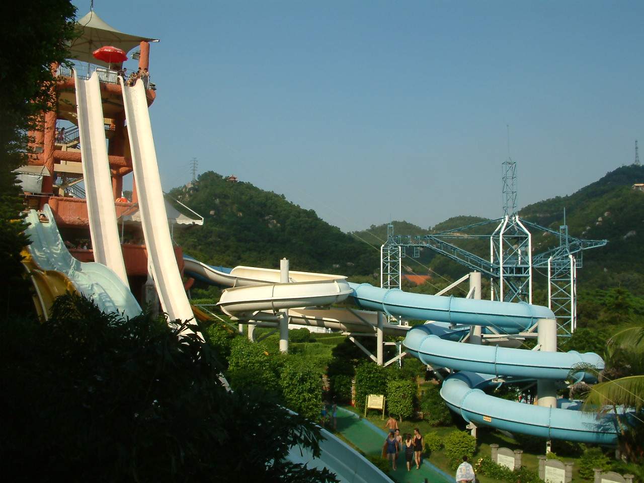 二、濃蔭蔽日、棕櫚搖曳的南國風(fēng)情使人心曠神怡。 闊別一冬的夢(mèng)幻水城已經(jīng)成為一個(gè)濃蔭蔽日、棕櫚搖曳的綠色的世界,漂流河、兒童池、滑道以及情侶池等被綠蔭所掩蓋,那些爬藤植物使所有的遮陰棚看起來象一座座涼爽的小屋,使“古老的廊堡”更添滄桑感。在一片綠色的世界下面,潔凈的水汩汩而流,水槍水炮在樹逢里噴射,這是一個(gè)真正的清涼世界。