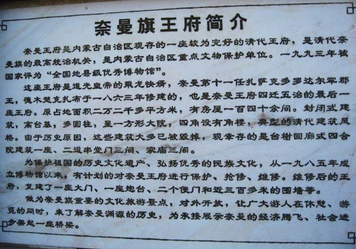 奈曼王府坐落于內(nèi)蒙古自治區(qū)通遼市,始建于清同治二年(公元1863年),為全國重點(diǎn)文物保護(hù)單位。占地面積9997平方米,有房屋190余間,系臺榭回廊式四合建筑。原為奈曼部首領(lǐng)札薩克多羅達(dá)爾漢郡王的府邸,現(xiàn)已對公眾開放。整個(gè)建筑風(fēng)格具有鮮明的蒙古民族特色,設(shè)計(jì)和布局反映了當(dāng)時(shí)王公的尊嚴(yán)和嚴(yán)格的等級制度。