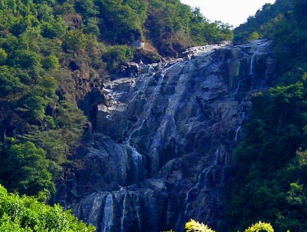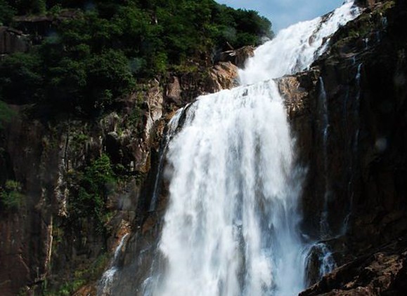 車子在山腳下??亢?,遠遠望去,前面深綠色的山峰上如掛著一幅隱約晃動的瑩亮的素色大綢幅,煞是好看。我懷疑那是不是以前的神仙在洞穴前垂掛的珠簾。我們徒步走在崎嶇蜿蜒的山間小路,朝著瀑布前進。起初聽到的是潺潺的流水聲,越往前進,水聲越大,嘩嘩直響。幾米、十米、幾十米……素色大綢幅越來越大,越來越雄偉,越來越壯觀。那浩浩蕩蕩的流水,如所向披靡的隊伍向著前方?jīng)_去。