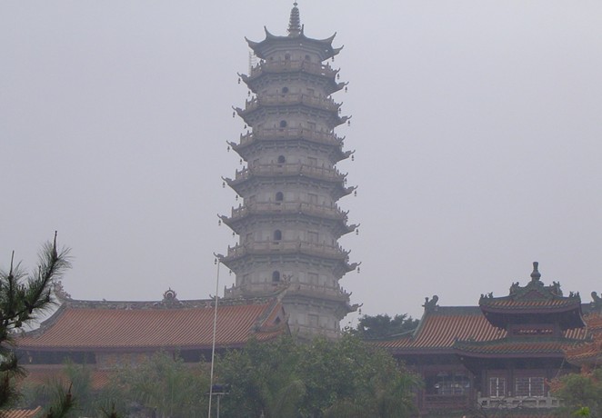 1990年,在政府支持和海內(nèi)外熱心人士捐款資助下,由千佛塔寺住持釋明慧法師,耗資4000多萬元,在大東巖山頂建造九層石塔,并經(jīng)上級(jí)批準(zhǔn),將"南漢千佛鐵塔"移置于新千佛塔底層,統(tǒng)稱為"千佛寶塔",由中國(guó)佛教協(xié)會(huì)主席趙樸初題署塔名,新建千佛塔九層高36米,千佛塔全用花崗巖石砌筑,高9層36米,高聳云天,氣勢(shì)宏偉。佛塔首層安放著鑄于南漢時(shí)期的千佛鐵塔。二 至八層內(nèi)壁鑲嵌著千尊漢白玉佛,第九層安裝一口一噸重的大銅鐘,并在該層內(nèi)墻存放千尊小金佛,塔內(nèi)上下共有佛像三千尊。塔頂則為一座小巧玲瓏的石塔,形成塔下有塔、塔中有塔、鐵佛玉佛金佛共容一塔的特色,被譽(yù)為寶塔建筑藝術(shù)一大奇觀。沿塔梯盤旋而上,石塔外圍砌筑走廊、欄桿,供游人登高憑欄眺望,秀麗的梅城風(fēng)光盡收眼簾。千佛殿與九曲文化游廊連接一體,成為梅州市和粵東地區(qū)的一大名勝。