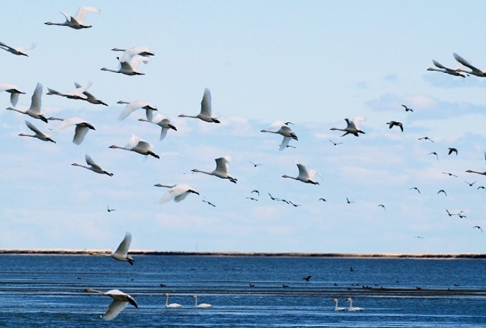 這里湖水清清,水草繁茂,蘆葦蓊郁,一望無(wú)際,猶如一條綠色的緞帶,平鋪在呼倫、貝爾兩湖中間。這個(gè)綠色的世界象塊巨大的磁場(chǎng),吸引著眾多鳥類在春天從我國(guó)南方、東南亞飛臨這絕妙的世外桃源安家落戶,生兒育女。