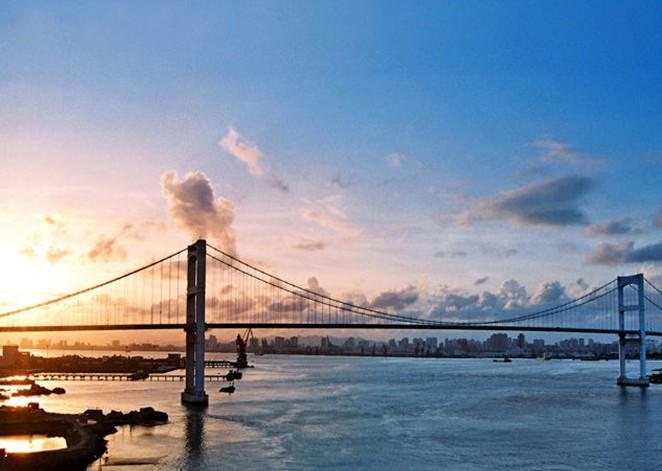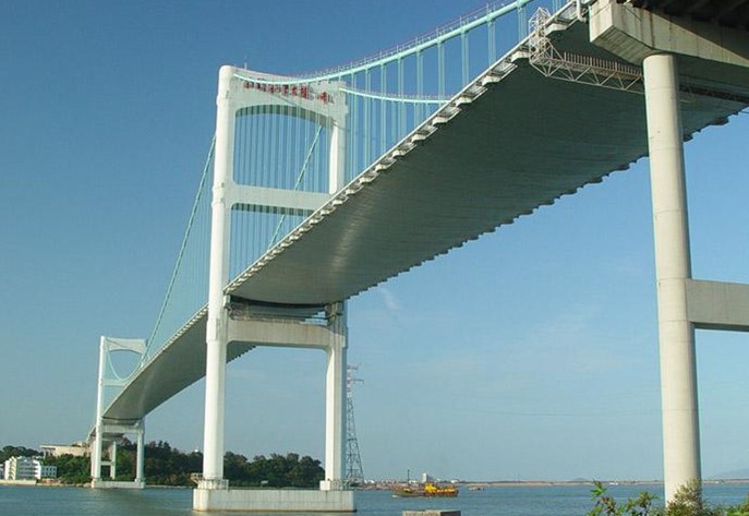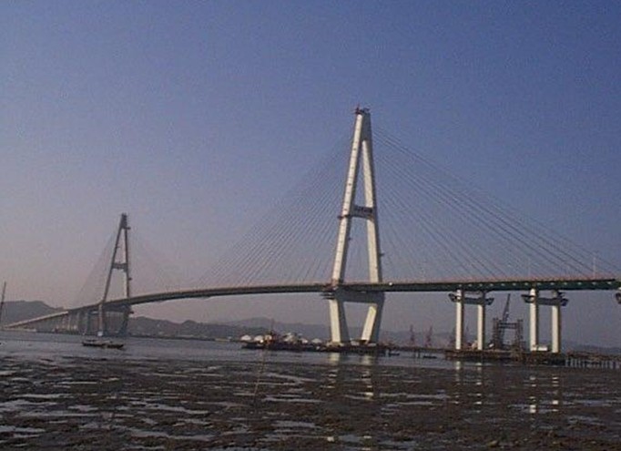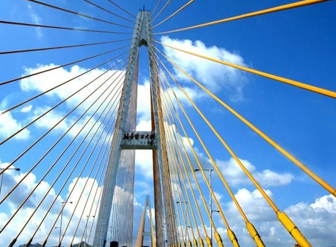 大橋為鋼筋混凝土斜拉橋,全長3500米,比海灣大橋長1000米,橋?qū)?0米,雙向6車道,主橋兩側(cè)設(shè)觀光人行道,主跨通航凈高38米,比海灣大橋低l米。