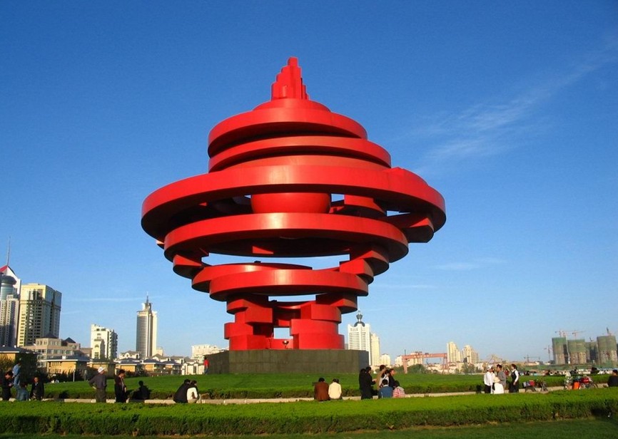 五四廣場建于1997年,北依青島市市政府辦公大樓,南臨浮山灣,位于東部新區(qū),市政府大樓南側(cè),有大型草坪、音樂噴泉,以及標志性雕塑“五月的風”,以螺旋上升的風的造型和火紅的色彩,充分體現(xiàn)了“五四運動”反帝反封建的愛國主義基調(diào)和張揚騰升的民族力量。對面海中有可噴高百米的水中噴泉,整個景區(qū)的氛圍顯得寧靜典雅、舒適祥和。這里已成為新世紀青島的標志性景觀之一。