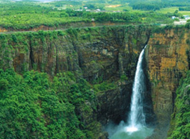峽谷頂部地貌平緩,壺口瀑布從200多米的懸崖峭壁飛流直下,形成了氣勢(shì)磅礴的山水奇觀。另有一條坡度達(dá)50度斜角的1386級(jí)石階的“通天梯”可達(dá)谷底。峽谷溝壑縱橫,奇峰林立,古木參天,構(gòu)成一幅巧奪天工的山水畫卷。