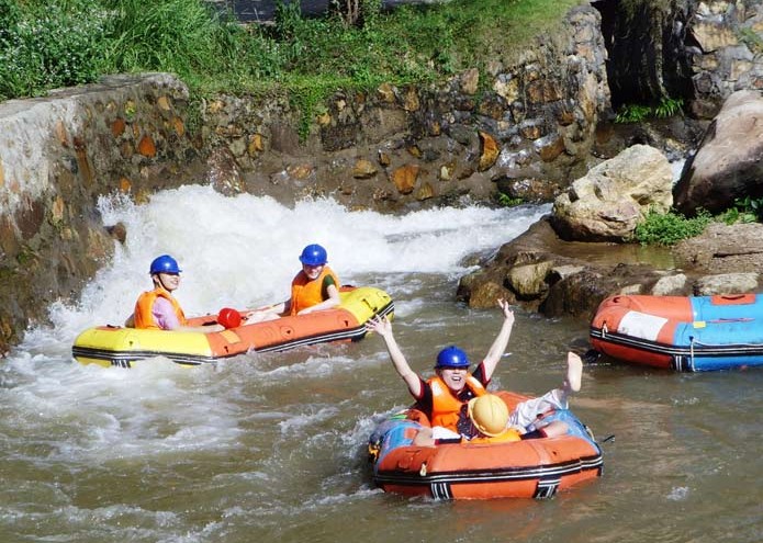 立于灘頭,沿江兩岸有大瑤山隧道、十里畫廊、龜山、蛙石等景點,有十多個回旋處。在漂流過程中,可盡享原始森林峽谷漂流之刺激,更可欣賞融山之雄、水之秀、林之幽、花之美、石之奇、瀑之壯、鳥之鳴、魚之樂于一身的原始森林山谷風光。