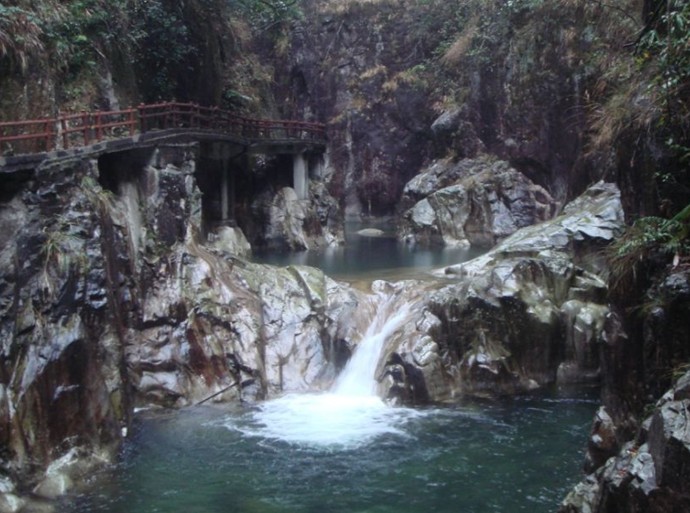 這是進入公園大門后的第一個景區(qū)。蓮池,顧名思義池中生長著睡蓮和各種各樣的蓮花,池岸婉然曲折,“荷花出淤不生塵,蓮葉如蓬睡美人。水榭瑤臺多雅韻,拱橋望月夜來新。”是蓮池映月的最好的寫照。徒步往大門后左側(cè)山坡沿小徑向上攀登,進入一片以木蘭科樹木組成的香花林。一路上花香陣陣,使人陶醉。靜坐林中小亭,體味一種遠離塵囂的感覺,便覺得不枉此行。香花林下山腳一片平緩山坡是森林燒烤場,遙遙聽見潺潺水聲,聞聲溯源,原來是蓮池之水源頭。一簾瀑布從天而降,飛珠濺玉,名為鵑山響水,有詩云:兩峽溝深坡峭陡,龍?zhí)镀俨柬戜?。鵑花開放紅如血,杜宇啼痕月一彎。在這一景區(qū)還設(shè)有山泉游泳池,水涼而鮮,是夏天游客望而心動的所在。