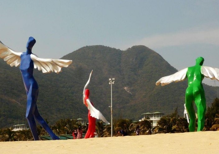 處于公園的中心,總面積達(dá)13萬平方米,有3個大小不一,風(fēng)格各異的張拉膜,每個張拉膜下都設(shè)有供游客休閑、更衣、洗手的各種設(shè)施。廣場的建設(shè)充分考慮到自然景觀和人文景觀的結(jié)合及層次,將各種植被及海洋、沙灘充分結(jié)合,使之相互映襯。站在廣場上極目遠(yuǎn)眺,茫茫水際碧波蕩漾,金黃的沙灘熠熠生輝。海風(fēng)拂過,廣場上樹影婆娑;艷陽之下,濃濃的綠意使夏日的酷暑黯然消退。