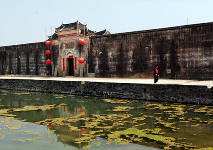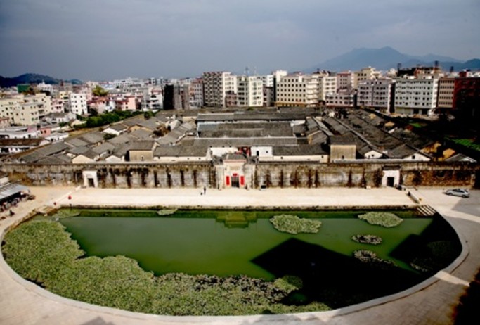 大萬世居坐落在深圳市龍崗區(qū)坪山街道大萬路33號坪壞社區(qū)西南的客家村,為古堡式客家圍龍屋建筑。建于清乾隆年間(1736-1795年),規(guī)模宏大,占地1.5萬平方米。平面呈方形,四角建有炮樓,正面有大六樓,均為高高的圍墻相連,圍墻上有走馬廊相通。圍龍屋大門向南,門樓上塑有“大萬世居”4個大字。大門前為禾坪,再前是月形池塘,禾坪側(cè)仍保留有旗桿石。