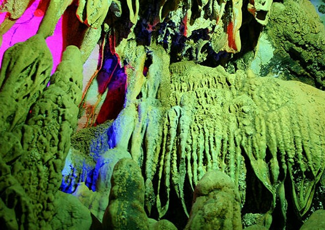 位于陽春市春灣景區(qū)內(nèi),巖洞全長1400米,龍泉溪水清澈,洞如長廊形,景物鬼斧神工、玲瓏剔透,有如龍宮之物。巖洞全程分四段:首段"迎賓廊","鐘乳寶塔"、"彩旗彩帶"招展,"石鼓"咚咚,"龍王水族"栩栩如生;次段是"龍王殿",兩側(cè)玉乳玲瓏,"龍宮浮雕"、"宮壁繡錦"惟妙惟肖;第三段為"聚寶庫",庫藏"鎮(zhèn)宮寶塔"、"定海神針"、"金玉龍床";第四段為"龍舟",其間石筍石幔琳瑯滿目,"龍宮羅帳"、"龍女寶鏡"、"龍女浴池"令人恍如身臨仙境。 大新縣龍宮巖又稱伏舊巖,國家二級景點(diǎn)。距縣城20公里,為喀斯特巖溶地貌。內(nèi)有四廳,廳廳相連,廳內(nèi)奇觀迭出,鐘乳、石筍、石花、石柱姿態(tài)各異,若獅若虎,似雞似鳥,或如蓮花朵朵,任由想象。更有層層天然水壩深潭,幽深清涼如入仙境。更為奇異者,第四廳中有一巨龍盤臥,鱗爪畢現(xiàn),栩栩如生,令人嘆為觀止。