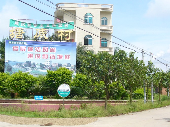 塘底村地處新民鎮(zhèn)西北部,全村現(xiàn)有人口1182人,耕地面積490畝,種果面積450畝,2005年實(shí)現(xiàn)人均純收入達(dá)3000多元。近年來(lái),該村致力把村容、村貌環(huán)境建設(shè)作為新時(shí)期農(nóng)村工作的首要任務(wù)來(lái)抓好,高標(biāo)準(zhǔn)、高起點(diǎn)建起了初具規(guī)模的生態(tài)文明新農(nóng)村。至2005年底止,全村共投資280多萬(wàn)無(wú),清除雜竹1200多叢,28000多根,清理雜屋80多間,1500多平方米,推土8000多立方米,填污水塘5個(gè),建設(shè)環(huán)村道5.8公里,建設(shè)文化樓一幢,燈光球場(chǎng)一個(gè),大舞臺(tái)一個(gè),種植大王椰108棵、蘇鐵106棵、黃金梅球88個(gè)、黃皮果苗1600株、草皮1000平方米,綠化面積達(dá)3900平方米,房屋門前硬底化面積3500平方米,從而使整個(gè)村莊的精神面貌煥然一新。該村在抓好生態(tài)文明村建設(shè)的同時(shí),著力抓好社會(huì)治安綜合治理和民主法制教育以及反腐倡廉教育,村中無(wú)打架、斗毆、吸毒、賭博,無(wú)重大刑事案件發(fā)生。近年來(lái),該村先后被授予廣東省文明村、廉江市生態(tài)文明村、無(wú)毒社區(qū)、安全文明小區(qū)和湛江市優(yōu)秀安全文明小區(qū)、湛江市民主法治示范村等光榮稱號(hào),是省、市反腐倡廉教育進(jìn)農(nóng)村示范點(diǎn)。