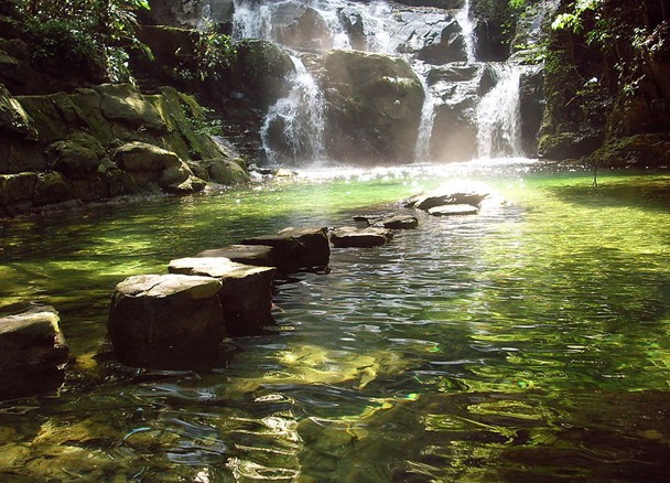 鼎湖山飛水潭,又名龍?zhí)讹w瀑,位于鼎湖山南半山腰、慶云古剎下東側(cè)。 去飛水潭,由榮睿碑亭拾級登山,沿曲徑云封直上,至半山腰向右拐,過眠綠亭即可。當然,亦可在榮壑碑亭前面的山溪邊起步,一直溯溪而上。這里,山石嶙峋,瀑布從40多米高的崖頂深處狂奔而來,直往下飛瀉,忽而形成千尺飛流,如白練懸空,忽而濺作滿空雨花,如輕紗曼舞。瀑布下,如注的水流匯成一泓碧水,中有巨石,上刻“枕流”2字。辛亥革命后,孫中山先生偕夫人宋慶齡游覽鼎湖山時,曾在此游泳,現(xiàn)崖壁上刻有宋慶齡手書的“孫中山游泳處”6個大字。潭水由此再往下傾瀉,繼而形成另一個深潭,據(jù)傳為蟄龍窟,故曰:浴龍池。 飛水潭側(cè)建有更衣室,崖間建有觀瀑亭,崖壁鐫刻著許多贊美飛水潭的摩崖大字和方寸小楷,如“噴雪”、“能移我情”、“天然圖畫”、“飛泉咽危石”等,頗有詩情畫意。 夏日到此,觀瀑、游泳、濯足,均感遍體清涼,煩熱頓消。