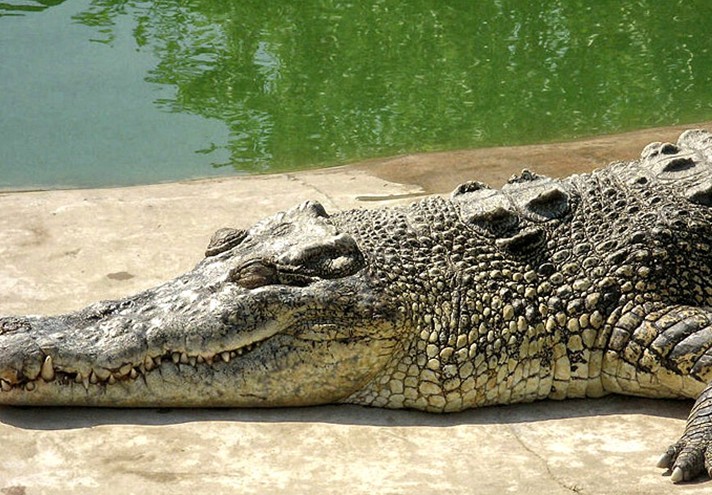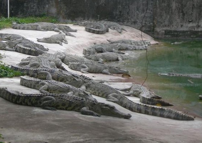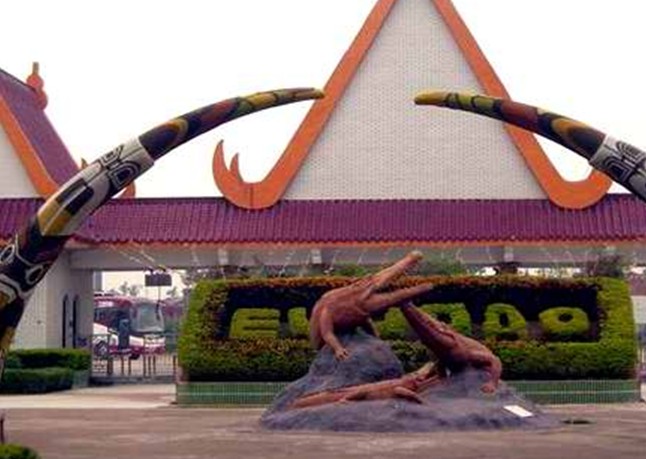 在白藤湖內(nèi)尖峰橋湖心路口即可望到鱷魚島那金碧輝煌,巍峨壯麗的泰式門樓,門前寬廣的停車場可一次性停放上百輛大巴,進入大門后,有一個十分醒目、高達4米的大型鱷魚雕像——“鱷魚一家”吸收不少游客紛紛在此攝影留念,離雕像百米處,十多個鱷魚池座落在鮮花叢中、綠茵地上、池中養(yǎng)有我們祖先稱為“噴火龍”、“鮫龍”的楊子鱷、泰國灣鱷、馬來鱷、雜交鱷等四個品種,大小近千條,最小的有剛出殼的幼鱷,體型最大的有4米多長,重達千斤。