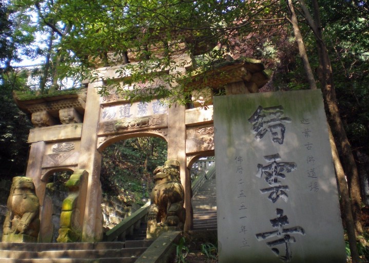 縉云山是具有1500多年歷史的佛教勝地。山中縉云寺,始建于南朝劉宋景平元年(423年),后曾稱“相思寺”、“崇勝寺”、“崇教寺”,受到歷代帝王封賜。寺中自古辦學(xué),名為“縉云書院”。寺內(nèi)現(xiàn)存有宋太宗誦讀過的24部梵經(jīng)。寺外石照壁上“豬化龍”浮雕,為六朝文物。另有出土的石刻天王半身殘像,據(jù)傳是梁或北周作品。唐高祖李淵(618年)曾親筆題名“禪真宮”,唐大中元年(847年),宣宗皇帝賜寺額為 “相思寺”,系山有相思巖、相思竹、相思鳥之故。唐乾符元年(874年),定濟和尚重建寺廟,971年慧歡禪師主持修葺殿宇。998年,宋真宗將太宗讀過的梵經(jīng)240卷送到這里,供奉在寺中。宋景德四年,真宗賜名“崇勝寺”。明永樂五年成祖皇帝敕諭“縉云勝景”,明天順元年(1462年)英宗皇帝又踢名“崇教寺”,萬歷三十年神宗皇帝下令改為縉云寺,賜題“迦葉道場”。明末清初,寺毀于火災(zāi).傳說是因為當(dāng)時寺內(nèi)和尚,橫行四鄰,當(dāng)?shù)乩习傩蘸拗牍?,趁張獻忠入川時,聚眾上山一把火把寺燒毀,現(xiàn)存的寺廟是清康熙二十二年(1683年)由破空和尚主持修復(fù)的。1930年秋,曾任世界佛學(xué)苑苑長、中國佛教學(xué)會會長、中國佛教整理委員會主任的太虛大師(1889-1947)“游化人川”,得知四川劉湘有“選派漢人入藏”之意,乃建議成立漢藏教理院,以研究漢藏教理,融洽中華民族,發(fā)揚漢藏佛學(xué),增進世界文化交流,得到了渝州(今重慶)軍、政、金融界知名人士的大力支持,遂選定縉云寺作校址,推選劉文輝為名譽院長、太虛為院長、何北衡為院護,共同組成漢藏教理院董事會。該院辦學(xué)20年,為我國培養(yǎng)了大批佛教人才。當(dāng)年學(xué)生現(xiàn)遍及世界各地,重慶佛教協(xié)會會長惟賢法師等均是太虛法師的學(xué)生。縉云寺漢藏教理院號稱世界佛學(xué)苑四大分院之一。寺內(nèi)大雄寶殿上塑有迦葉古佛,高約2米。兩旁站立帝釋、梵天,都是清代塑像。其外有一匾額,上書“曇花藹瑞”。寺內(nèi)還有一口大鐵鐘,高約1.60米,底徑1.50米,腰徑0 9米,為清道光二年(1822年)所鑄。山門外,兩棵參天銀杏直向青天,古剎鐘聲與山間松濤相映成趣。寺內(nèi)的雙柏精舍為方丈居室,兩側(cè)禪房與石刻,形成古色古香的意趣。在寺 外,還存有世界佛學(xué)苑漢藏教理院碑記及太虛法師和正果法師塔各一座,上有趙樸初和鄧穎超的親筆題字。