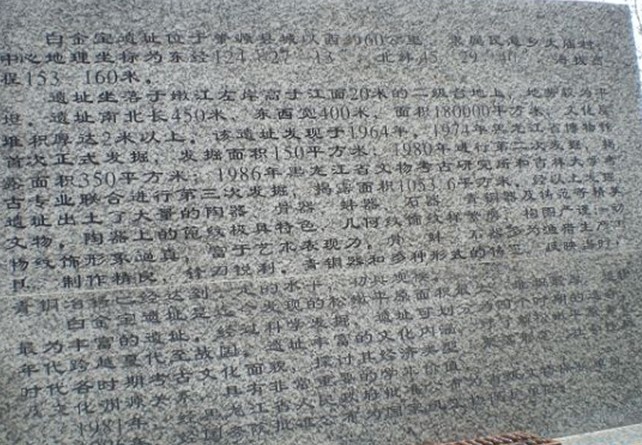 白金寶遺址位于肇源縣民意鄉(xiāng)嫩江左岸的白金寶屯。白金寶屯的南側(cè)是寬闊的嫩江河床灘地,北側(cè)是嫩江左岸的二級階地。階地面高出嫩江水面約30米,西北較高,向東南漸趨平緩,那上面豎起了一方標(biāo)志石碑,版權(quán)所有山東聊城聊之旅國際旅行社有限公司,轉(zhuǎn)載必究!這里是白金寶遺址的核心地帶。