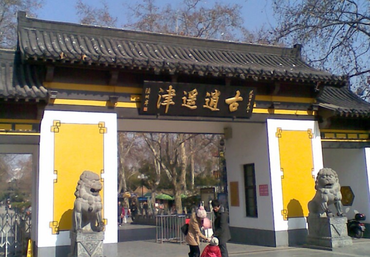公園南大門(mén)是一座高近10米、三開(kāi)間、牌樓式的仿古大門(mén)。大門(mén)上方一塊古色古香的牌匾上書(shū)“古逍遙津”四個(gè)鎏金大字,字為清狀元、宣統(tǒng)皇帝溥儀的老師陸潤(rùn)庠手書(shū)。進(jìn)入公園,首先看到的是一尊持槍躍馬的張遼青銅塑像。塑像高達(dá)5米,底座上有“威震逍遙津”五個(gè)大字。