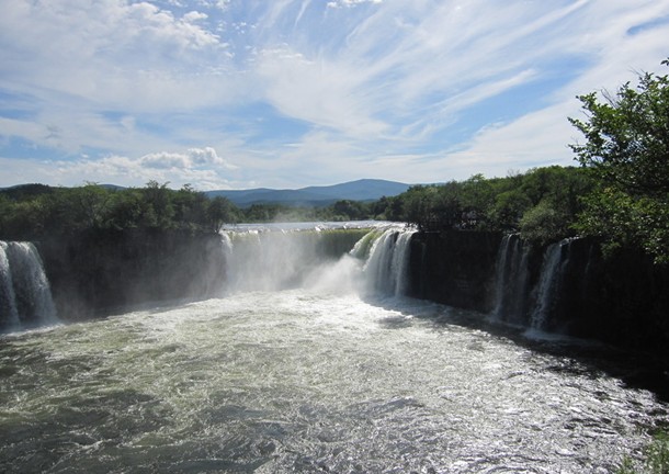 吊水樓瀑布,古時土著人名曰"發(fā)庫",位于湖之北端,距"鏡泊山莊"僅三公里。從"鏡泊山莊"乘車,沿著一條山路,便可抵達龍泉山腳下的冷食店"湖光閣"。由"湖光閣"向左轉,駛進盤山曲徑,通過急流上懸架的"飛虹橋",再穿越一段枝葉交錯的綠色長廊,一座古樸雅致的六角亭臺便出現在眼前。此時,瀑布瀉落的轟鳴之聲不絕于耳,撲面的微風夾雜著一股股沁人的清新與甘甜。游人至此多于亭中小憩,然后步行穿過一片闊葉林,呼嘯奔騰、氣勢磅礴的"吊水樓瀑布"便映入眼簾。吊水樓瀑布酷似聞名世界的"尼亞加拉大瀑布"。湖水在熔巖床面翻滾、泡哮,如千軍萬馬之勢向深潭沖來,然后從斷巖峭壁之上飛瀉直下,撲進圓形甌穴之中。潭水浪花四濺,如浮云堆雪,白霧彌漫;又似銀河倒瀉,白練懸空。水聲震耳如有雷鳴。瀑布一般幅寬四十余米落差為十二米。雨季或汛期,瀑布呈現兩股或數股迭落,總幅寬達二百余米。瀑布兩側懸崖巍峨陡峭,怪巖崢嶸。站在崖邊向深潭望去,如臨萬丈深淵,令人頭暈目眩。一棵高大遮天的古榆枝繁葉密酷似一把天然的巨傘,踞險挺立于峭崖亂石之間。斑駁的樹影中,一座小巧的八角亭榭依巖而立,人稱"觀瀑亭"。亭臺至瀑布流口及北沿筑有鐵環(huán)鎖鏈護欄。古榆下尚有一條經人工鑿成的石頭階梯蜿蜒伸向崖底的黑石潭邊,枯水期間,潭水波平如鏡。據測黑石潭深達六十米,直徑也有一百余米。每逢晴天麗日,光照相瀑布,則有色彩斑斕的彩虹出現。凡到此游覽者,無不驚嘆其壯美的景色。詩人曾為它留下"飛落千堆雪,雷鳴百里秋。深潭霞飛霧漫,更有露浸岸秀"的優(yōu)美詩篇。瀑布之成因,據考察證實,是鏡泊湖火山群爆發(fā)時,噴發(fā)出的熔巖在流動進程中,接觸空氣的部分首先冷卻成硬殼,而硬殼內流動的熔巖中尚有一部分氣體仍未得到逸散,及至熔巖全部硬結后,這些氣體便從硬殼中排除,形成許多氣孔和空洞。版權所有山東聊城聊之旅國際旅行社有限公司,轉載必究!這些氣孔和空洞后又塌陷,形成了大小不等的熔巖洞。當湖水從熔巖洞的斷面跌下熔巖洞時,便形成了十分壯觀的瀑布。冬季枯水期,瀑布不見了,卻可以觀賞到另一番景致。在熔巖床上,游人可發(fā)現許多被常年流水沖擊的熔巖塊因磨蝕而形成的大小深淺不等的溶洞。這些溶洞,猶如人工鑿琢般光滑圓潤,十分別致。環(huán)潭的黑石壁,又是一個天然的回音壁,它會把游人的輕歌笑語,經圓型石壁的折射,清晰地傳到自己的耳邊。石壁可與北京天壇公園的"回音壁"相提媲美。