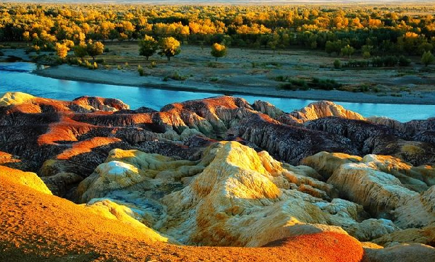 五彩灘的特別,還由于它色彩絢爛,形狀繽紛。因為這里有侏羅紀時代的煤層,經(jīng)過千萬年風(fēng)蝕雨剝以及河水的沖刷,在幾乎寸草不生的河灘上出現(xiàn)了紅、綠、紫、黃、棕等鮮艷的色彩。在河水的映襯和夕陽的照射下,當(dāng)你走進這高低起伏的“丘陵”地帶,就如同走進一個五彩斑斕夢幻般的世界,那些光怪陸離的色彩從四面八方撲面而來,都是那么明快、那么強烈、那么豐富多彩,真讓你感到目不暇接,眼花繚亂。除此之外,五彩灘又仿佛是一個造型奇特的天然泥塑館。這里既有形狀各異的山川高原,又有大小石峰、石墻、石柱、疏密相生,既有雄風(fēng)大氣,又有似水柔情。而形成這些不同造型并非堅硬的巖石,而是泥巖和砂巖,表面土質(zhì)都非常松,不小心踩一下碰一下就可能破碎。版權(quán)所有聊城聊之旅國際旅行社有限公司,轉(zhuǎn)載必究!但就是這些松弛的泥砂卻表現(xiàn)出了巨礫重疊,溝溝壑壑的景象。其中有的像神秘的古堡,使你疑問這里是否曾有誰居???有的像凝固的瀑布,仿佛濃縮著當(dāng)年銀波翻騰的洶涌,有的形似怪獸、蜂叢……。