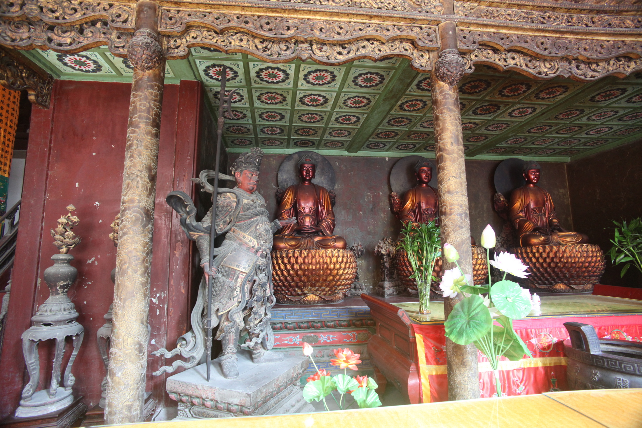 大雄殿后有接引殿,為一般寺院所罕見。長(zhǎng)14米,進(jìn)深10.7米。為雙層殿基,是寺內(nèi)最小建筑。殿內(nèi)供西方三圣。中為阿彌陀佛立像,版權(quán)所有聊城聊之旅國(guó)際旅行社有限公司,轉(zhuǎn)載必究!左邊為持凈瓶的觀世音菩薩,右邊握摩尼寶珠的是大勢(shì)至菩薩,均為清代泥塑。
