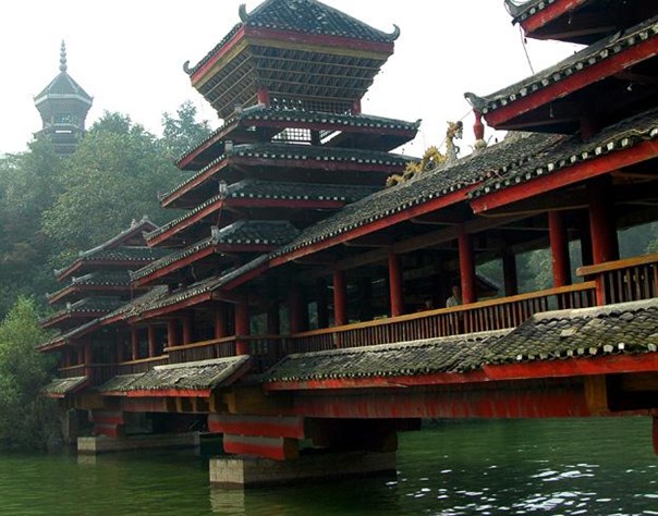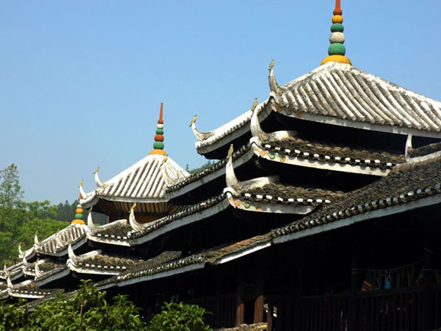 地坪坪風(fēng)雨橋又名花橋,始建于清光緒二十年(1894年)。橋總長(zhǎng)70米,高出水面8米,寬4.5米,河中立一青石石墩。橋?yàn)槟举|(zhì)結(jié)構(gòu),橋的下部由兩排各為8根粗大杉木穿榫連成一體,分兩層呈天平狀向邊懸掛。每層挑出約兩米。橋廊兩側(cè)有一米高的梳齒欄桿。欄桿外面又有一層外桃1.4米的挑檐。橋廊內(nèi)兩側(cè)下面設(shè)置連通板凳供人歇憩。 看地坪風(fēng)雨橋真正要看的是它的裝飾。地坪風(fēng)雨橋上部為花板,繪有各種侗族風(fēng)慶人物故事山水、花木、動(dòng)物等彩畫。此外,“樓葉,樓”四柱繪有4條青龍抱柱,版權(quán)所有山東聊城聊之旅國(guó)際旅行社有限公司,轉(zhuǎn)載必究!頂層花板又繪有龍虎鶴牛齊歡圖案。橋兩頭柱壁上畫了三幅楹聯(lián)。 另外在北面的平地上配建有——座風(fēng)雨主亭,高約9米,為6角攢尖頂,同樣具有濃厚的民族特色.