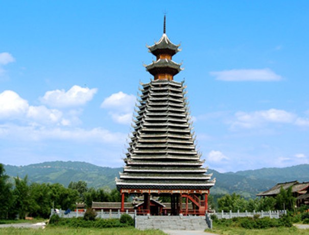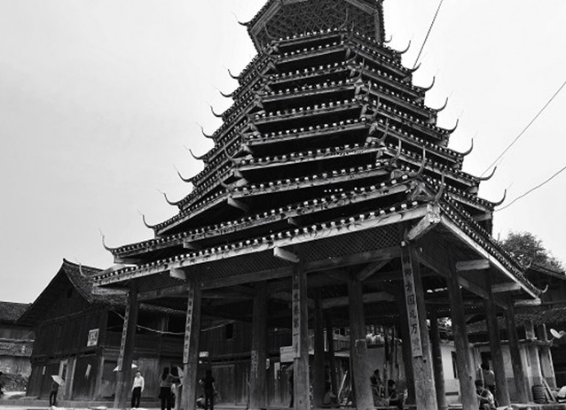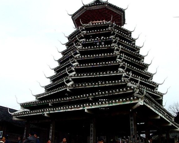 紀(jì)堂鼓樓位于貴州省黎平縣肇興鄉(xiāng)紀(jì)堂寨上,共3座。十分雄偉壯觀,1982年,紀(jì)堂鼓樓被列為省級(jí)重點(diǎn)文物保護(hù)單位。紀(jì)堂分上寨下寨,各有一座鼓樓,由十二根大杉樹(shù)原木支撐而起。塔身分八角,而頂層卻變化為四角攢尖頂花重檐。鼓樓周圍的地面和民居的走道上都以卵石鑲嵌成象征喜慶吉祥的圖案。紀(jì)堂鼓樓建筑年代久遠(yuǎn),曾多次修葺。1966年遭到破壞,1978年當(dāng)?shù)囟弊迦嗣褡栽斧I(xiàn)工獻(xiàn)料重新修復(fù)。塘明鼓樓由12根大杉木立于柱礎(chǔ)之上,高約22米,突兀寨中。該樓以逐層內(nèi)收的梁枋和全爪柱支撐層層挑出層檐,形如寶塔,內(nèi)無(wú)層板,空至寶頂。鼓樓基面約160平方米,中央用青石板鑲成一個(gè)火塘,周圍有簡(jiǎn)易木凳。樓前有一歌坪,坪邊建有一個(gè)小巧玲瓏的侗戲臺(tái),與鼓樓相對(duì)。該樓底層呈方形,上為八角形,共有9重檐,為四角攢尖頂。版權(quán)所有山東聊城聊之旅國(guó)際旅行社有限公司,轉(zhuǎn)載必究!鐵制寶頂下有如意斗裝飾。檐面鋪小青瓦。屋脊白色,翼角高翹而起,裝有套獸,塑有獅、虎、鳳、猴、兔、蛇、蟲(chóng)、鳥(niǎo)等動(dòng)物雕塑裝飾。樓內(nèi)亦雕梁畫棟。樓上一二層檐之間有“二龍戲珠”木雕,大門上有“幸福堂”金字匾額,耀眼奪目。