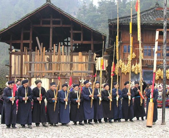 貴客進郎德上寨得按苗家禮俗喝攔路酒。從寨腳公路開始,到寨頭的進寨門樓,設(shè)迎客攔路酒卡,多達12道。每道酒卡,在路中間放一張方桌,兩邊站著幾個身著盛裝的苗族男女青年,提壺端杯,向客人敬酒,每道兩土碗,表示福壽雙全。最后一道酒卡是進寨門樓,土碗換成了大牛角。如此一路想滿飲進寨者,非“海量”莫能。不過不善飲酒的客人也不必擔心,只要你雙手背在身后,彎腰用唇輕觸酒杯即離,并有禮貌他說一聲“兜社莫”(苗語“謝謝你”)就可以“過關(guān)”了。主人雖然好客,但絕不會強人所難。歡迎儀式還有燃鐵炮、放鞭炮、奏莽筒、唱酒歌等。在這之后,婦女們身穿繡衣條裙,頭戴銀角冠,男子們則長袍馬褂,全村盡出,把客人引至寨中心蘆簽場。場上銅鼓高懸,青年鄉(xiāng)民在這里為客人獻上傳統(tǒng)的苗族歌舞:蘆笙舞、板凳舞、木鼓舞,銅鼓舞……最后,全村男女老少絡(luò)繹上場,圍成若干個同心圓,隨著銅鼓點子款款繞場起舞,客人們也被邀入場內(nèi),使狂歡活動達到高潮。歌舞之后,可信步走人普通苗家,那“吱呀”的紡車,“嚓嚓”的布機,講述著大山中寧靜的生活,熱情的村民定會邀你在吃新節(jié)或過苗年時再來,那是他們最隆重的節(jié)日。