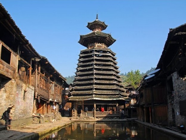 鼓樓文化”,是以“侗寨鼓樓”為代表,含鼓樓、戲樓、花橋(風(fēng)雨橋)等侗族建筑在內(nèi)的民俗建筑文化體系。貴州東南角的黎平、從江、榕江一帶是侗族的高度聚居區(qū),歷史上,其地曾以“峒”為行政單位,故將其地村民稱之為“峒民”、“硐民”或“洞民”。據(jù)說,這是侗族稱謂的由來。侗族自己,則自稱“甘”。侗寨鼓樓酷似一棵大杉樹,村民稱為“遮蔭樹”,可見它來源于自然,是仿生學(xué)在建筑文化中的具體運用。侗寨鼓樓與漢族地區(qū)的鼓樓不僅造型各異,功能亦不相同,前者既是侗族村民聚眾議事的社會活動中心,又是政治、文化活動場所。在貴州300多座侗寨鼓樓中,版權(quán)所有山東聊城聊之旅國際旅行社有限公司,轉(zhuǎn)載必究!從江縣的“增沖鼓樓”是年代最早、體量最大、工藝最精的一座。此樓建于清初,為十三重檐八角攢尖頂結(jié)構(gòu),通高20余米,占地100多平方米,于1988年被國務(wù)院公布為全國重點文物保護(hù)單位。在其附近,建有一座風(fēng)雨橋,也是“增沖鼓樓”的組成部分。大概為了不與鼓樓爭主角,心甘情愿當(dāng)配角,不雕不繪,樸實無華,僅在橋頭雕塑吉祥動物作為“保護(hù)神”。侗族喜歡唱侗戲,侗寨里頭戲樓多,有的寨子多至四五座。侗寨戲樓多建于寨子中央,與鼓樓、歌坪緊密結(jié)合,構(gòu)成侗寨的“心臟”。侗戲為著名戲師吳文彩首創(chuàng)。由于侗戲是在侗族民歌和民間故事基礎(chǔ)上發(fā)展起來的,群眾基礎(chǔ)好,很容易普及,故而大批戲樓應(yīng)運而建,僅從江縣目前即有100多座。侗寨戲樓是用侗鄉(xiāng)盛產(chǎn)之優(yōu)良杉材建成的,樓面多蓋杉樹皮,有的也蓋小青瓦。蓋瓦的樓脊上,正中彩塑二龍搶寶,脊端精雕鴟吻鰲魚,翼角高翹,瀟灑飄逸。戲臺面闊13至14米,進(jìn)深7至8米。臺前罩面枋上多有木雕,飾有游龍飛鳳、人物故事、花鳥蟲魚,五顏六色,琳瑯滿目,富有濃厚的民族風(fēng)格。侗寨戲樓有個共同的特點,即多半建于魚塘上。此舉不僅節(jié)約用地,還便于防火防潮。特別有趣的是,臺上演戲,臺下養(yǎng)魚,人歡魚躍,相映成趣。侗族喜歡住水邊。溪澗縱橫,流水潺潺,小橋人家,是侗寨風(fēng)光的一大特色。有河有水便有橋,河多水多橋自多。據(jù)不完全統(tǒng)計,僅黎平、從江、榕江三縣即有各式各樣的風(fēng)雨橋300余座。橋本是水上交通設(shè)施,但侗寨風(fēng)雨橋除了作為交通設(shè)施使用外,還有裝點江山、培修風(fēng)水等功能。侗族風(fēng)俗認(rèn)為,村頭寨尾修建風(fēng)雨橋,可以保住寨子里的財富不隨水流走。侗寨風(fēng)雨橋不僅是富有的象征,還是富有的保障。許多風(fēng)雨橋,彩塑彩繪,花花綠綠,人稱“花橋”。在眾多的花橋中,黎平縣的“地坪花橋”最為壯觀。橋橫跨南江河,全長57米。橋上建有長廊,廊上建有3座亭子,中間一座酷似鼓樓,人稱“花橋鼓樓”。在這座風(fēng)雨橋的長廊內(nèi)和花橋鼓樓上,繪有20多幅侗鄉(xiāng)風(fēng)俗畫,諸如侗姑紡紗、侗姑織錦、激流放排、吹笙比賽、雙牛角斗、行歌坐月、南江小景等等。地坪風(fēng)雨橋于2001年被公布為全國重點文物保護(hù)單位。