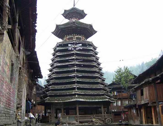 始建于清代康熙十一年(1672)秋。版權(quán)所有山東聊城聊之旅國際旅行社有限公司,轉(zhuǎn)載必究!該樓為木質(zhì)結(jié)構(gòu),形如寶塔,雙葫蘆頂。高25米,占地面積160平方米。內(nèi)有4根大柱,每根直徑0•8米,高15米,每柱之間距離3.6米,構(gòu)成椎形方架,是鼓樓的骨干部分。距4大柱外圍3米處,豎有8根高3.5米的支柱,將大柱團(tuán)團(tuán)圍住,并以穿枋與內(nèi)柱相連,呈輻射狀。一層樓上疊有數(shù)層,每層有8根短爪柱層層疊豎,直至第十一層。鼓樓頂部,還有兩層八檐八角的傘頂寶塔,名曰“干梗”,其工藝精細(xì),為中國木質(zhì)結(jié)構(gòu)建筑中所罕見。在此層頂閣中,有一個長約3米,直徑約10公分的木鼓。最頂部嵌有陶瓷寶珠尖頂,直插云霄。頂閣下面各層梁上釘有橡皮,并用大小羊桃藤捶爛與石灰拌合架瓦,十分牢固。檐閣下畫有龍、鳳、魚、蟹、蝦等動物圖案,美麗壯觀。此樓的最低層嵌有3扇大門,正中設(shè)有一個火坑,周圍鋪青石片。該鼓樓為國家級重點文物保護(hù)單位。中國清代侗族建筑。在貴州省從江縣西北約50公里的增沖寨。據(jù)碑文記載,始建于清康熙十一年(1673),道光、光緒時曾維修。鼓樓系侗族特有的民俗建筑,是侗家聚眾議事、排解糾紛、迎送賓客、對唱大歌和吹笙踩堂等重大活動的場所。一般一姓建鼓樓一座,因此又是族姓的形象標(biāo)志。增沖鼓樓既保存了中國古代建筑的特色,又具有濃厚的民族風(fēng)格,規(guī)模宏大,造型美觀,工藝精湛,具有較高的價值。1988年中華人民共和國國務(wù)院公布為全國重點文物保護(hù)單位。1997年6月,國家郵電部曾發(fā)行《侗族建筑》一套四枚郵票,其中有一枚就是增沖鼓樓。由此可見增沖鼓樓在由數(shù)不清的鼓樓、花橋、戲臺和吊腳樓構(gòu)筑的五彩繽紛的侗鄉(xiāng)建筑中所占的地位。