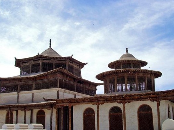 哈密回王陵由墓群和艾提尕爾清真寺(兩部分)組成。墓群原有土木結(jié)構(gòu)的大小拱拜六座,埋藏著歷代回王及其王妃,現(xiàn)剩兩座,最大的拱拜(墓葬)為七世回王伯錫爾、回王福晉以及八世回王莫合買特及其王妃、王族等40余人的墓。該拱拜高17.8米,下部呈長方形,東西長20米,南北寬15米。上為穹隆頂,墓門兩側(cè)塔柱中空,有臺階盤旋而上,可至墓頂。拱拜南側(cè),有木質(zhì)亭式拱拜2座。東部一座為九世回王沙木胡索特拱拜;西部一座為臺吉拱拜。九世回王拱拜底部正方形,邊長各15.5米,內(nèi)部以土坯壘砌伊斯蘭式的穹隆頂墓室,外部于垣墻內(nèi)及四周用亭柱支撐漢族亭樓木結(jié)構(gòu)的八角攢尖頂,建筑將墓室罩在其中,飛檐起脊,雕梁畫棟。這兩座木質(zhì)拱拜,版權(quán)所有山東聊城聊之旅國際旅行社有限公司,轉(zhuǎn)載必究!在建筑形式上,以伊斯蘭式的穹隆為基礎(chǔ),同時吸收了內(nèi)地八角攢尖頂及蒙古式盔頂?shù)哪举|(zhì)結(jié)構(gòu)建筑形式,將多種風(fēng)格融為一體,在新疆的伊斯蘭陵墓建筑,極具特色,是中原文化、蒙古文化和伊斯蘭文化相融合的產(chǎn)物。