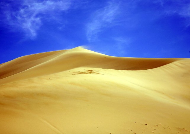 巴里坤鳴沙山位于新疆巴里坤哈薩克自治縣境內(nèi),西距縣城60公里,四周被豐美碧綠的草場所包圍,猶如湛藍大海中的一座金色小島。鳴沙山形似一朵蘑菇,高約百米,沙丘陡峭,其下有水泉,左右兩側(cè)有河流通過。據(jù)說這里是唐代女將樊梨花西征遇難的地方,聽到的沙鳴,就是女兵們當(dāng)時擂鼓助陣和沖殺鼓掌之聲。