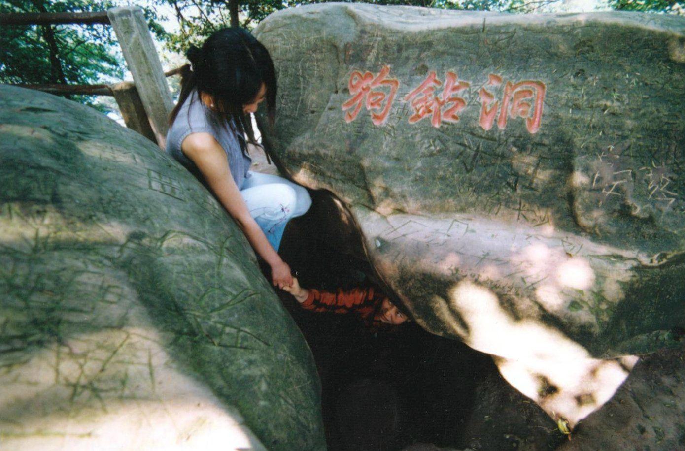 狗鉆洞:大舍身巖之北,相去100余米。數(shù)巨石重疊阻隔了道路,東西北皆懸崖,東西崖高近60米,在幾塊巨石中有一窄洞是必經(jīng)之道。洞內(nèi)不能蹲立,只可手地梭行。出口處右側(cè)臨空,所有蹲石可落腳,雖手扶洞內(nèi)石壁,腳點(diǎn)石壁間痕,蜿身而下,方可通過。因過此洞形同狗爬狀,故得名狗鉆洞。