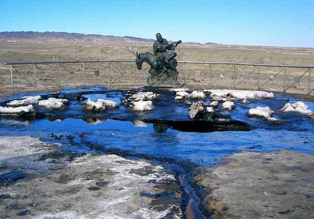 黑油山位于克拉瑪依東北部,距市中心兩公里多,是油田重要油苗露頭的地方,因原油長年外溢結(jié)成一群瀝青丘,最大的一個高13米,面積0.2平方公里,油質(zhì)為珍貴低凝油。"克拉瑪依” 維吾爾語為“黑油”,故這個天然石油瀝青丘且得名黑油山。這座黑色的瀝青山以及它地下埋藏的石油在這里已沉睡上億年。由于地殼變動,巖石產(chǎn)生斷裂破碎,地下石油受地層壓力影響,巖石裂隙不斷向地表滲出,石油中輕質(zhì)部分揮發(fā),剩下稠液同沙土凝結(jié)堆成此黑油山,由于周圍荒涼的惡劣環(huán)境,千百年來它不被人們重視。直到解放前,一位叫塞里木巴依的維吾爾老人,第一次叩響了黑油山大門,他在山旁搭了個地窩子,在集油洼地撈取原油,騎毛驢往返于烏蘇與黑油山間,用黑色的油換取生活用品,當?shù)厝擞么嗽忘c燈,膏車軸等。為發(fā)揚艱苦創(chuàng)業(yè)精神,版權(quán)所有山東聊城聊之旅國際旅行社有限公司,轉(zhuǎn)載必究!新疆石油管理局和克拉瑪依市1982年10月1日在黑油山樹立了近3米高的石雕紀念碑和一尊維吾爾老人騎著毛驢彈奏熱瓦普的塑像。1983年建成從礦史陳列館通往黑油山的瀝青混凝土公路及停車場,到達山頂?shù)氖A也建成。 黑油山已成為各族人民進行革命傳統(tǒng)教育的紀念地和游覽勝地。
