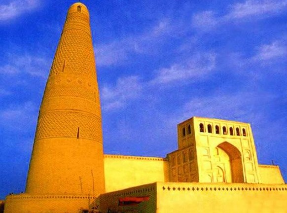 在清朝初年,吐魯番郡王額敏和卓為了“報(bào)答天恩”開(kāi)始在此修建大型禮拜寺,未竣,額敏和卓卒,后由其子蘇萊曼于乾隆四十三年(1778年)建成,故名蘇公塔禮拜寺。寺前左隅聳立著高約44米的土黃色大磚塔,版權(quán)所有山東聊城聊之旅國(guó)際旅行社有限公司,轉(zhuǎn)載必究!塔身上遍砌花紋,綺麗非凡,特別引人注目,后人往往忽略禮拜寺其他建筑,而單稱(chēng)此塔,名為蘇公塔,也叫額敏塔。