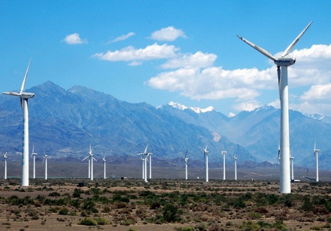 在烏魯木齊去吐魯番的途中,沿路南行,在通往絲路重鎮(zhèn)達(dá)坂城的道路兩旁,上百臺風(fēng)力發(fā)電機(jī)擎天而立、迎風(fēng)飛旋,與藍(lán)天、白云相襯,在博格達(dá)峰清奇峻秀的背景下,在廣袤的曠野之上,形成了一個蔚為壯觀的風(fēng)車大世界。這里就是目前我國最大的風(fēng)能基地——新疆達(dá)坂城風(fēng)力發(fā)電廠。