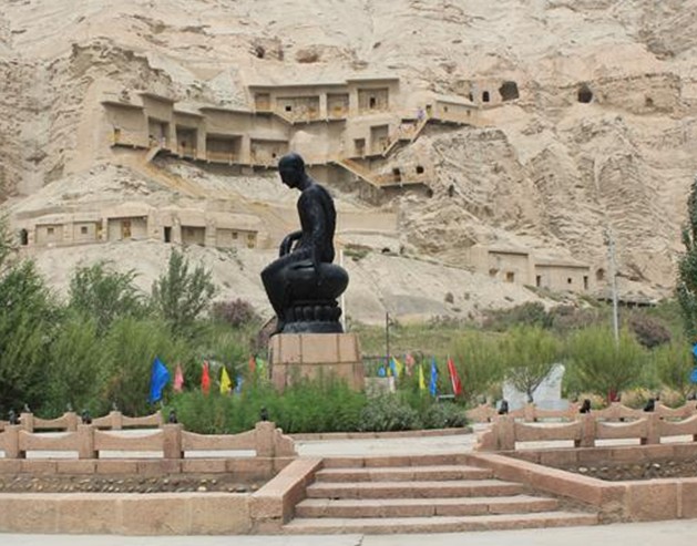 據考證,我國古代有名的高僧 —— 鴆摩羅什出生在龜茲。他的母親是龜茲王白純的妹妹。他 7歲出家, 9 歲跟隨母親到了北天竺,在名僧盤土多達多處學習佛經。 12 歲時,同母親一起返回龜茲。龜茲王聽說他回來了,親自遠迎,并專門為他造了金獅子座,以大秦錦褥鋪之,并請他升座說法。西域各國國王一見他升座,都在他的座側聽講。 公元 401 年,鴆摩羅什到了長安,后秦王款待他以國師之禮。從此,他就在長安國立譯場逍遙園,從事佛經的翻譯,與直諦、玄奘并稱為我國佛教三大翻譯家。他和他的弟子共譯出佛經 74 部, 384 卷, 對我國佛教文化做出不可磨滅的貢獻?!读簳酚涊d,漢武帝時有 “ 外國澡罐一口 ” ,銘云:“ 元封二年,龜茲國獻。 ” 說明在 2000 年前,佛教在龜茲已普遍傳布,而且澡罐這種佛教器物被作為一種貴重禮物獻給了漢武帝。鳩摩羅什銅像矗立在克孜爾石窟前。鳩摩羅什是中國四大佛經翻譯家之一。