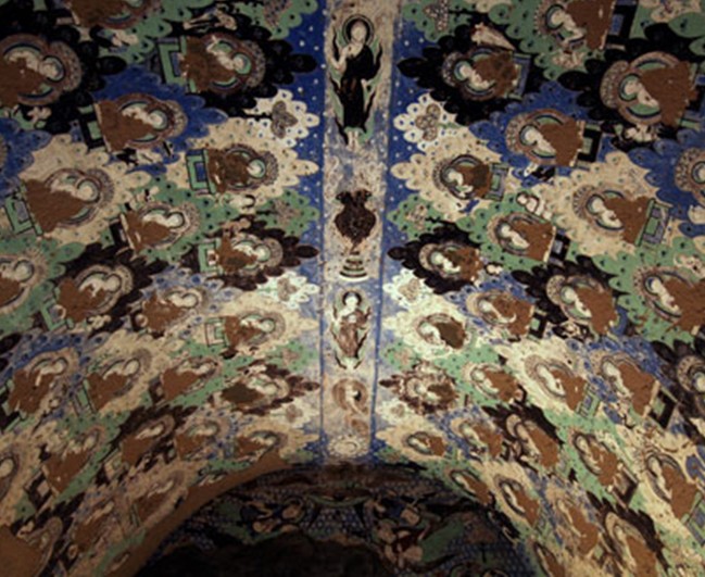 再往后到了公元6-7世紀,為其繁盛期,目前石窟中一半都是屬于這個時期建筑而成的,造像普遍采用金粉或金箔敷貼。在此方形窟中因緣畫較為突出.建筑上以大型中心柱居多。因緣故事就是記釋迦加牟尼成佛后,云游四方,傳播佛法,常以因緣故事喻人,就產生了因緣故事,傳播因果輪回之說。大家看這個第8窟的菱格因緣圖,上畫的是猴子奉蜜于佛,佛云有蟲,猴去蟲又奉之,又曰太濃,猴就加泉水以稀之,再奉,佛和眾弟子飲了,猴很開心,一高興跌入水坑淹死了,因前身奉過佛,來生生于富貴人家做了富人,此類因緣故事在石窟中有100多種上千幅,但內容較難識辨,其種類數量卻屬國內罕見。