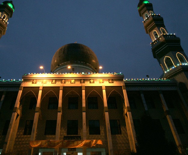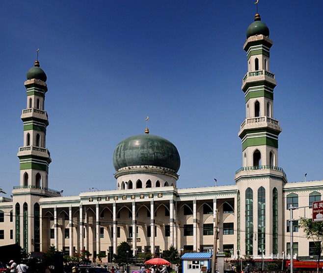 庫爾勒清真大寺位于庫爾勒市中心"老城"地方,1987年重建,規(guī)模宏偉,整潔寬敞,裝飾華麗,建筑風(fēng)格頗新穎。殿堂、院內(nèi)可同時(shí)容納7千僑匯人作禮拜。迎街門樓高25米,分7層,每層有房間若干,為阿訇、毛拉司事休憩之處。殿堂內(nèi)設(shè)冷風(fēng)機(jī),頂棚高懸吊燈、吊扇。四壁繪有維吾爾風(fēng)格的圖案,版權(quán)所有山東聊城聊之旅國(guó)際旅行社有限公司,轉(zhuǎn)載必究!并書寫了許多《古蘭經(jīng)》文。