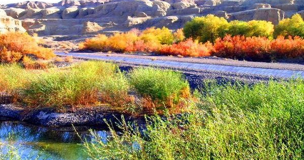 白楊河蜿蜒,黃色沙粒滿眼,只有戈壁、山巖、胡楊、碧水、藍天組成的峽谷景致,永遠蕩漾,廣袤而單調的戈壁因為有了白楊河而更顯克拉瑪依的豐富、神奇和美麗!