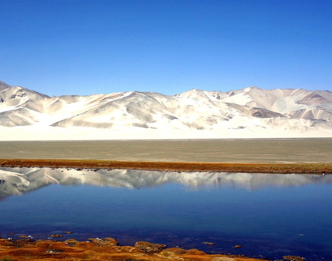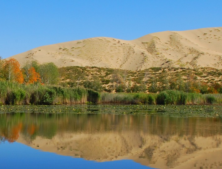 白沙湖,湖面只有0.5平方公里。是個獨立于浩瀚沙漠中的原生態(tài)沙漠湖,沒有進水與出水口,沙漠里一般蒸發(fā)量都比較大,但這里的水位多年來卻沒有變化,更不因季節(jié)變遷而增多或減少。景致構成十分獨特,湖中四周生長著高達1—4米的密密叢生的蘆葦、菖蒲等水生植物,湖中還有野荷花孤寂地生存著;湖周50米內,是高大茂密的楊樹、白樺混生的林帶。